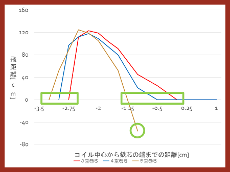 このグラフから、鉄芯がコイルの中心から2.25cm離れているときに飛距離が最高になることがわかりました。このときに、電流が流れている間に鉄芯がされた仕事が最大になっていると考えられます。