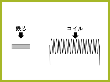 また鉄芯にどのような力が加わっているのかを調べるために、図の実験を行いました。鉄芯に糸を通し、ばねばかりにつないで、手で持ちます。鉄芯の下には、電源装置につないだコイルを置きました。