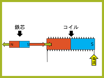 ここで注意しなければいけないのが、コイルに電流を流し続けると、鉄芯はコイル中心に向かって力が加わるため、コイル中心を超えると逆方向に力が加わり、元の位置に逆戻りします。そこで力の方向が変わる前に電流を止めることでコイルも鉄芯も磁力が無くなり、鉄芯は慣性で引き合う方向に進み続けます