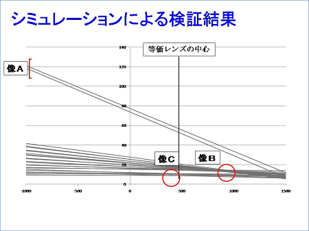 結果が図の通りです。等価レンズと溶液がそれぞれ形成する各像の出現位置はほぼ一致しています。以上の結果から私たちが求めた等価レンズは溶液と同等の作用を持つことが証明できました。