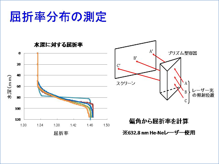 最初に本年度もショ糖が拡散した溶液の各水深における屈折率を測定し、屈折率勾配を求めました。溶液の水槽の角をプリズムに見立て、図の通りレーザー光を各水深に入射させ、偏角を測定することで各水深の屈折率を計算しました。