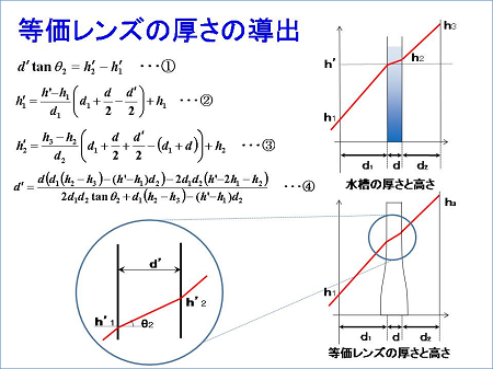 断面の曲線がわかったので、厚さも求めました。ある水深でのレンズの厚みが求められれば、あとは曲線の式を当てはめて、全体の厚みが決定できます。したがって、水槽がレンズ作用を持たない水深h’での厚みを(4)式から決定しました。レンズ作用を持たない水深では、等価レンズは真っすぐ(接線の傾きは90度)であるからです。