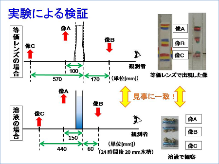 この等価レンズが実際にショ糖拡散溶液と等価であるか、シミュレーションと実験の両方で実証しました。