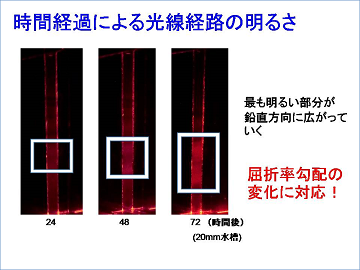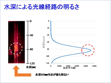 さらに、各水深での光線経路の明るさは、水深80mm付近が最も明るく、時間の経過に伴って最も明るい部分が上下に広がることもわかりました。