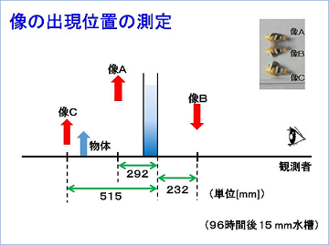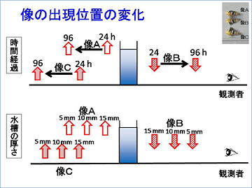 時間が経過するとショ糖の拡散が進み、各レンズの効果は弱まります。また水槽が薄くなってもレンズの効果は弱まると考えられます。したがって、これらの出現位置とその変化は、各像がそれぞれ凹レンズ、強い凸レンズ、弱い凸レンズの作用であることを示しています。