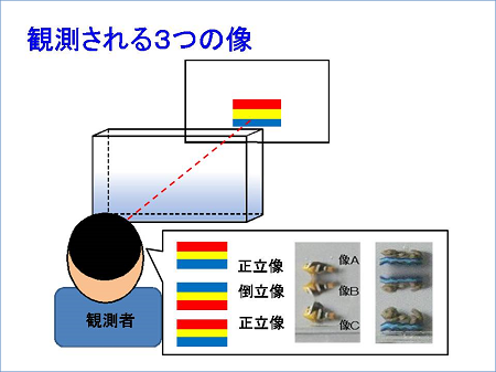 この溶液を通して水槽の背後の物体を観察すると、蜃気楼に相当する3つの像が観察されます。