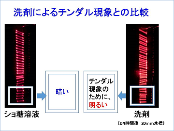 また、チンダル現象が発生している液体洗剤の溶液と比較すると、洗剤溶液はチンダル現象によって全体が明るくなっており、ショ糖溶液の方が明らかに暗いことがわかります。このことから、光線経路が目視できるのはチンダル現象に拠るものではないことも確認できました。