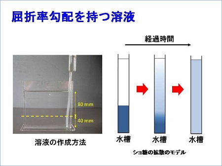 図のように真水の水槽の底にショ糖の飽和溶液を静かに注入して放置すると、時間の経過とともにショ糖がゆっくりと拡散し、水面に向けて濃度が連続的に変化している溶液となります。さらに、濃度変化に応じて光の屈折率も連続的に変化します。このような溶液を「屈折率勾配を持つ溶液」といいます。