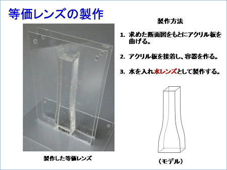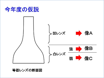 ・屈折率勾配を持つ溶液と同様のレンズ作用を持つレンズの形状を求め、そのレンズの形状から各像が出現する原理の昨年度までの解釈を新たな面から検証することができると考えました。(金原さん)