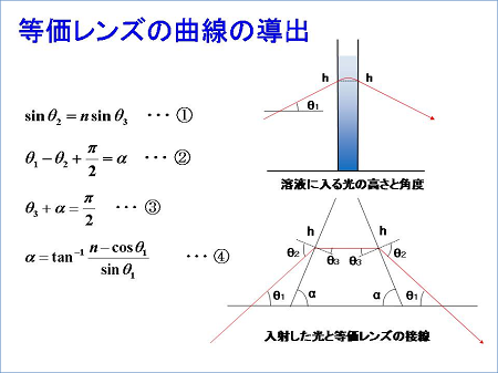 次の図の(4)式は、入射角・屈折角の関係とレンズ角度の幾何学的な関係(1)~(3)から導出できます。この(4)式と先ほどの光線経路を使うと、等価レンズの水深に対する接線の傾きが求められます。これを水深で積分することによって、等価レンズの水深に対する形状を求めました。