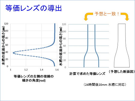 まず屈折率勾配を持つ溶液中の屈折率分布と出現する像の位置を正確に求めました。次にそのデータを基に等価レンズの断面図を計算によって導出し、作成したものと溶液のレンズ作用を比較しました。