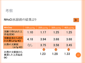 まずはKCl水溶液についてです。比熱の文献値と少しずれが生じているように思えます。しかし文献値から換算した上昇温度と実験の上昇温度を比較すると、ほぼ一致していることがわかります。