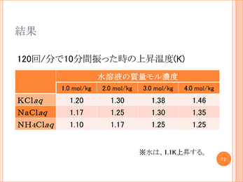 次に各水溶液の比熱を測定するため、室温のそれぞれの水溶液100gを120回/分の速度で10分間シェイカーを使って振り続けました。同じ操作を施した100gの純水の結果(1.1K上昇)と比較することで、温度変化と比熱の関係を算出しました。
