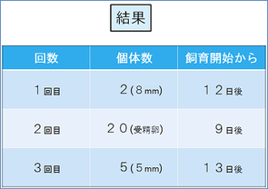 水槽に、昨年度から飼育している縦状模様のある繁殖期の雄と、今年4月以降に捕獲した腹の大きな繁殖期の雌を1匹ずつ入れて飼育しました。水槽の底には砂を敷き、直射日光を避けるため2面に黒い覆いをしました。以下の表は3回実験を行った結果です。1回目の実験では、開始から12日後に8mmの個体を2匹、2回目の実験では、実験開始から9日後に20個の受精卵を確認した2日後に15個体の孵化を確認しています。さらに、3回目の実験では、開始から13日後に5mmの個体を5匹確認しました。