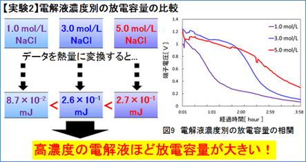それぞれの電池から取り出されたエネルギー量を計算したところ、それぞれ8.7×10-2mJ、2.6×10-1mJ、2.7×10-1mJとなり、高濃度の電解液ほど放電容量が大きいことがわかりました。