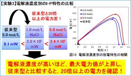 それぞれの電流の大きさにおける電池の電力値をグラフにしました。従来型モデルは、電圧は発生しますが、内部抵抗が大きいために電力値は0に近くなっています。一方で改良型モデルは、電圧が大きく出て、しかも内部抵抗が小さいため、電力値の最大値も大きくなっています。実際、従来型モデルと比較すると20倍以上の電力差があることがわかりました。
