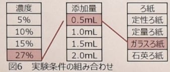 下図のように、ビタミンCの濃度・添加量とろ紙の種類の組み合わせを変えて実験してみました。すると、27%の飽和水溶液を0.5ml加え、ガラスろ紙を使用した時に異方性銅樹が再現できる、つまり結晶の成長スピードと銅イオンの供給スピードが釣り合うことがわかりました。