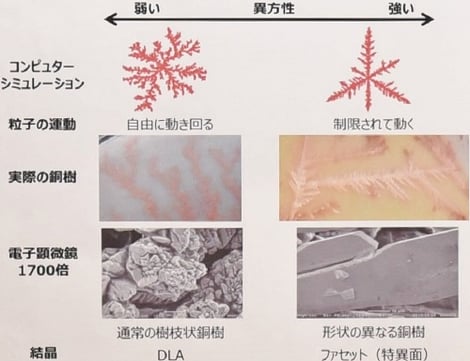 まず、形の異なる銅樹はどんなものなのか、解明を試みました。文献からよく似たものを発見し、コンピュータシミュレーションのデータを確かめると、粒子の運動に対する制限の有無によって銅樹の形が変わることがわかりました。この状況を「異方性(=物理的な性質が方向によって異なること)が働いている」と言います。そこで、この異方性が働いている銅樹を「異方性銅樹」と命名しました。