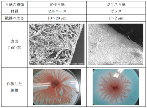 続いて、生成原理を解明するために、生成のポイントとなる、ガラスろ紙とビタミンCについて調べました。なぜガラスろ紙でできるかを調べるため、定性ろ紙とガラスろ紙を電子顕微鏡で見比べたところ、ガラスろ紙は緻密な構造を持っていることが確認でき、それが異方性銅樹の生成に必要であることがわかりました。