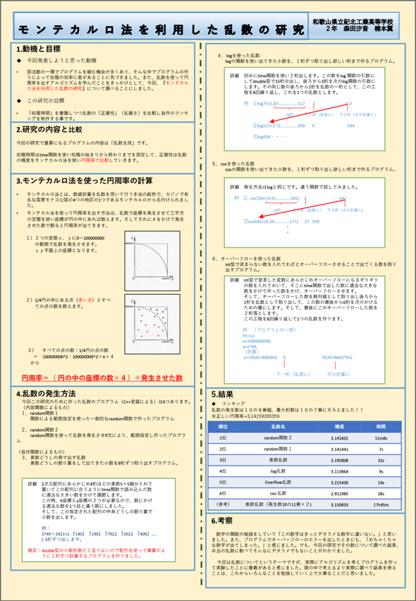 部活動の一環でプログラムを組む機会が多くあり、そんな中でプログラムの作りによって処理の効率に差があることに気づきました。また、乱数を使って円周率を出すアルゴリズムを学んだことをきっかけとして、今回、『モンテカルロ法を利用した乱数の研究』について調べることにしました。