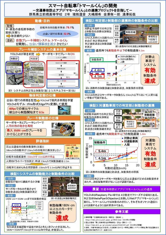 「トマールくん」の仕様は、物体検出AIによって自動車が判定されると、サーボモータによってブレーキレバーが引かれるというものである。静止している自動車に対する検証では、システムが人間と同等のオーダーで判定し、自動ブレーキ制動することに成功した。