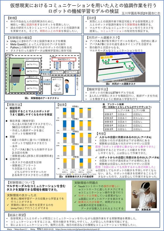 「人とロボットの協調作業」の研究は、中学3年から高校2年までの3年弱です。今年発表した研究は、2023年7月に、VR空間で実験を行うというアドバイスを玉川大学の稲邑哲也教授に頂いて始めたものなので、5か月になります。