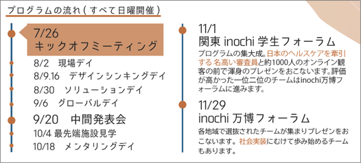 そして、11月の関東inochi学生フォーラムで、様々な分野の著名な審査員と300人の観客の前でプレゼンを行い、上位2チームが大阪で開催されるinochi学生・未来フォーラムに出場します。